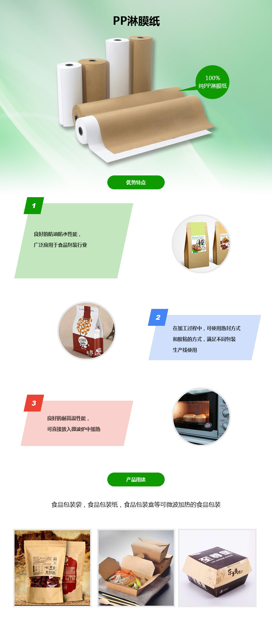 良好的防油防水性能,广泛应用于食品包装行业。 在加工过程中,可使用热封方式和胶粘的方式,满足不同包装生产线使用。可直接放入微波炉中加热。
